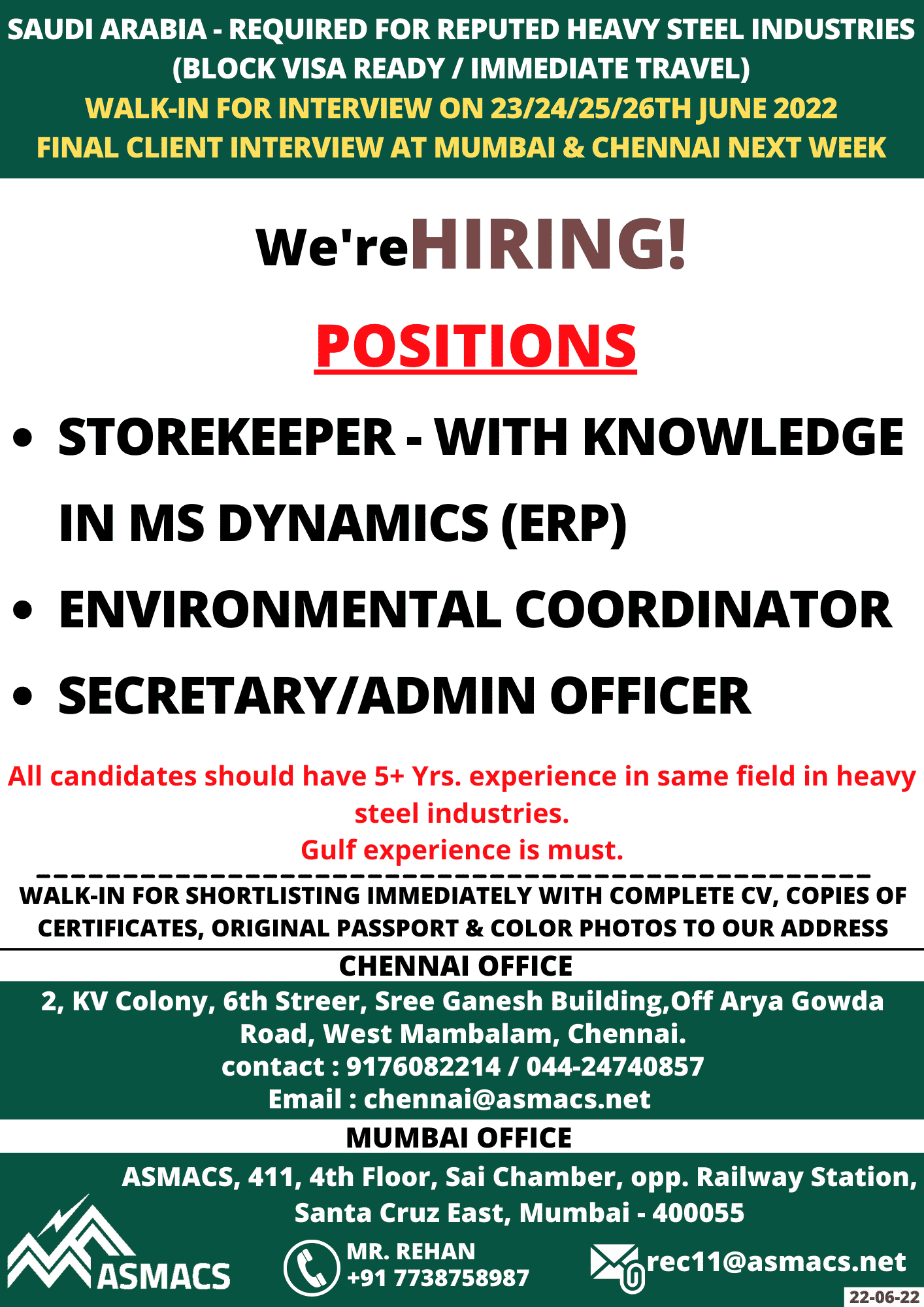 WALK-IN FOR INTERVIEW ON 23/24/25/26TH JUNE 2022