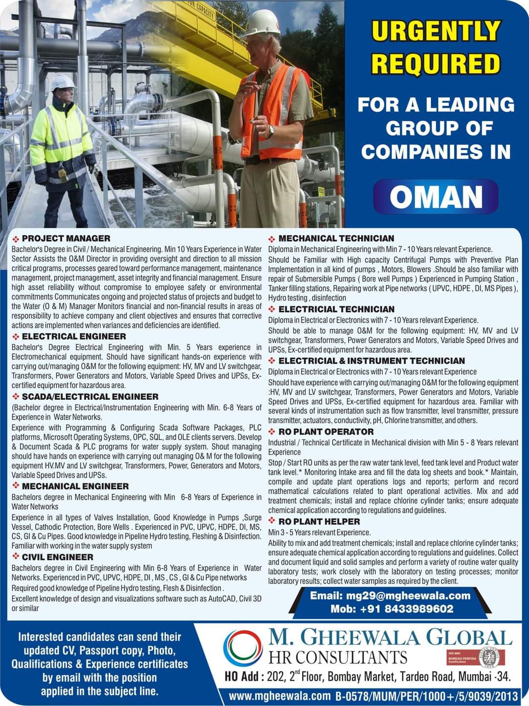 Bachelor’s Degree in Civil / Mechanical Engineering. Min 10 Years Experience in Water