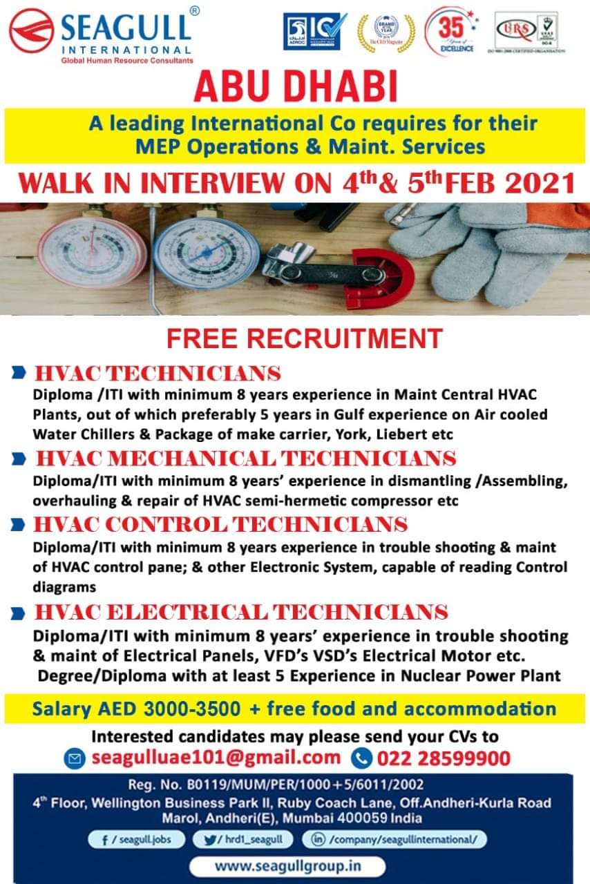 Diploma /ITI with minimum 8 years experience in Maint Central HVAC