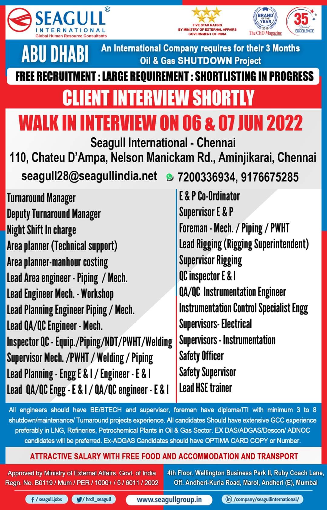 ATTRACTIVE SALARY WITH FREE FOOD AND ACCOMMODATION AND TRANSPORT