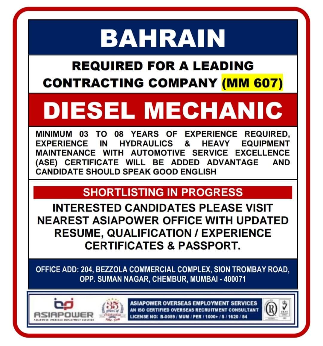 MINIMUM 03 TO 08 YEARS OF EXPERIENCE REQUIRED, EXPERIENCE IN HYDRAULICS & HEAVY EQUIPMENT MAINTENANCE WITH AUTOMOTIVE SERVICE EXCELLENCE (ASE) CERTIFICATE WILL BE ADDED ADVANTAGE AND CANDIDATE SHOULD SPEAK GOOD ENGLISH