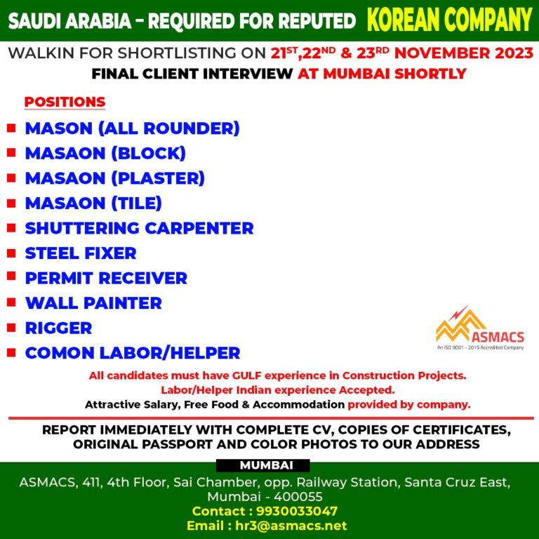 SAUDI ARABIA – REQUIRED FOR REPUTED KOREAN COMPANYWALKIN FOR SHORTLISTING ON 21ST,22ND & 23RD NOVEMBER 2023FINAL CLIENT INTERVIEW AT MUMBAI …