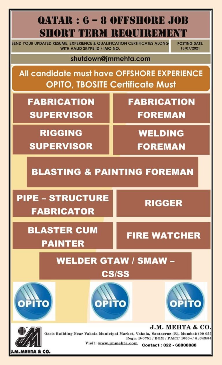 QATAR: 6-8 OFFSHORE JOBSHORT TERM REQUIREMENTSEND YOUR UPDATED RESUME, EXPERIENCE & QUALIFICATION CERTIFICATES ALONGWITH VALID SKYPE ID / IMO NO.POSTING …