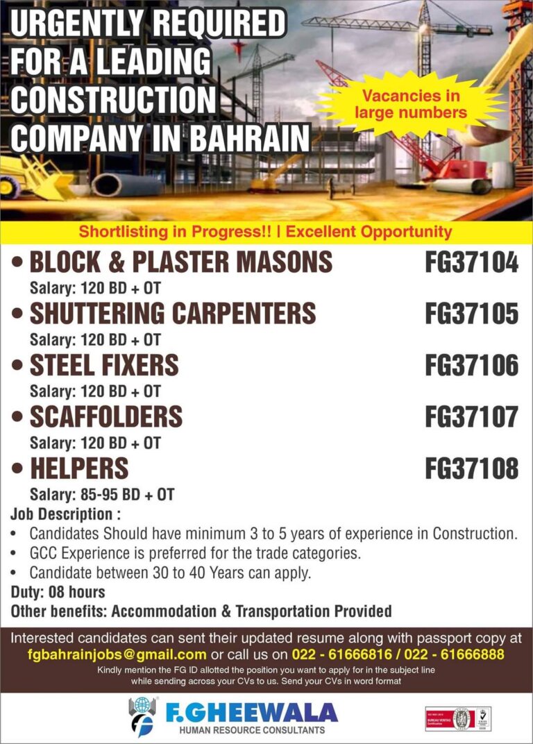 URGENTLY REQUIREDFOR A LEADINGCONSTRUCTION 4BCOMPANY IN BAHRAINVacancies inlarge numbersibYJShortlisting in Progress!! I Excellent OpportunityBLOCK & PLASTER MASONSsalary: 120 BD + …