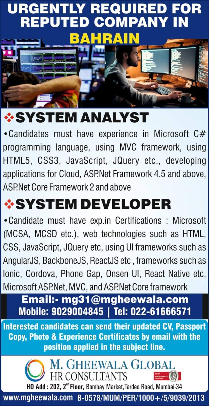 URGENTLY REQUIRED FORREPUTED COMPANY INBAHRAINSYSTEM ANALYST•Candidates must have experience in Microsoft C#programming language, using MVC framework, usingHTML5, CSS3, JavaScript, JQuery …