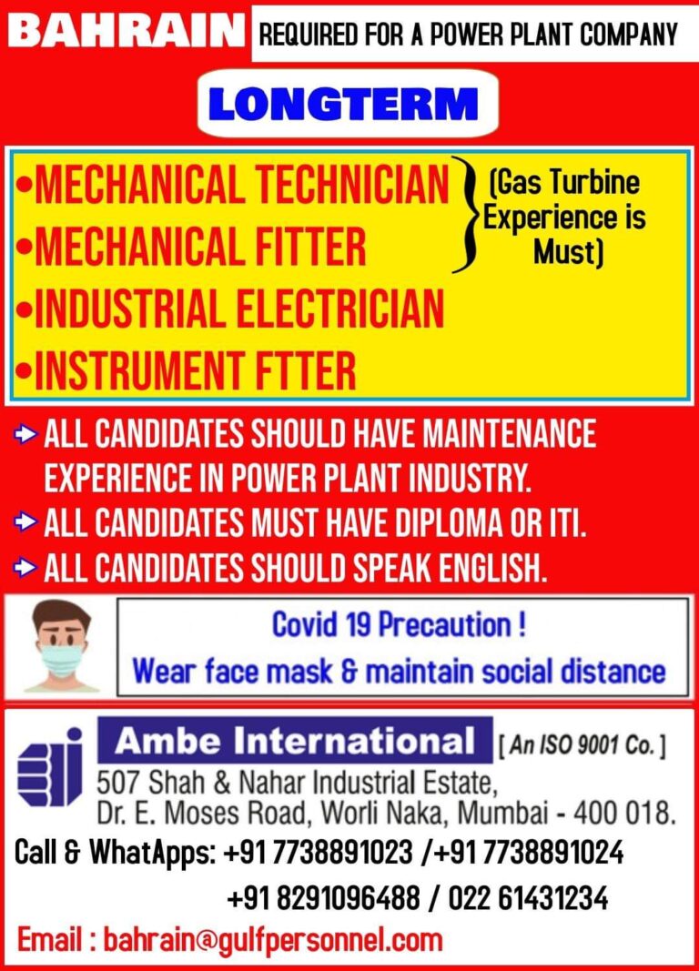 REQUIRED FOR A POWER PLANT COMPANYLONG TERM•MECHANICAL TECHNICIAN(Gas Turbine•MECHANICAL FITTERExperience is Must)INDUSTRIAL ELECTRICIAN•INSTRUMENT FITTERALL CANDIDATES SHOULD HAVE MAINTENANCEEXPERIENCE IN POWER …