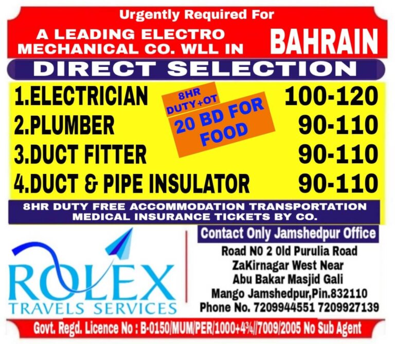 Urgently Required For A LEADING ELECTRO MECHANICAL CO. WLL IN BAHRAINDIRECT SELECTIONI.ELECTRICIAN100-1202.PWMBERFOO3.DUCT FITTER4.DUCT PIPE INSULATOR90-11090-11090-1108HR DUTY FREE ACCOMMODATION TRANSPORTATIONMEDICAL INSURANCE …