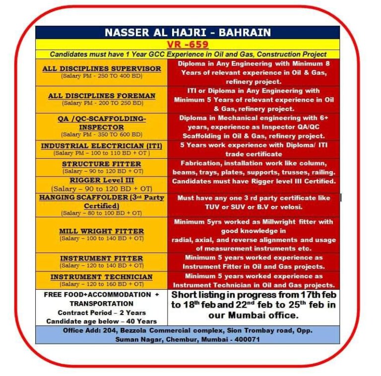 NASSER AL HAJRI – BAHRAINVR -659Candidates must have 1 Year GCC Experience in Oil and Gas, Construction ProjectALL DISCIPLINES SUPERVISOR(salary …