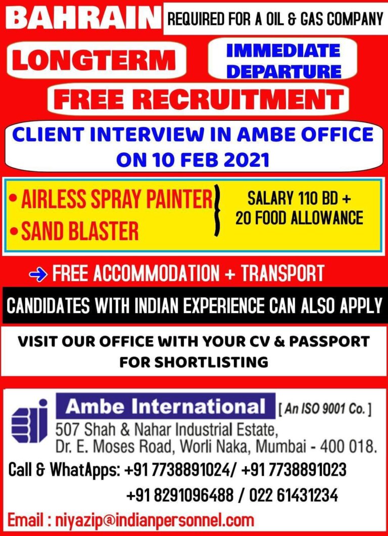 BAHRAINREQUIRED FOR A OIL GAS COMPANYIMMEDIATELONG TERMDEPARTUREFREE RECRUITMENTCLIENT INTERVIEW IN AMBE OFFICEON 10 FEB 2021AIRLESS SPRAY PAINTERSALARY 110 BD +20 …