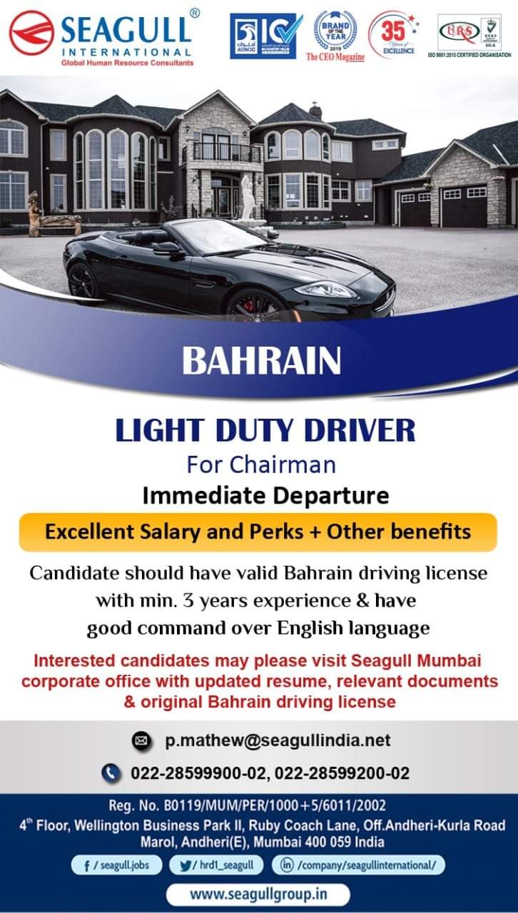 BAHRAINLIGHT DUTY DRIVERFor ChairmanImmediate DepartureExcellent Salary and Perks + Other benefitsCandidate should have valid Bahrain driving licensewith min. 5 years …