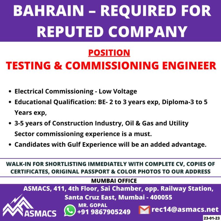 BAHRAIN – REQUIRED FORREPUTED COMPANYPOSITIONTESTING & COMMISSIONING ENGINEER• Electrical Commissioning – Low Voltage• Educational Qualification: BE- 2 to 3 years …