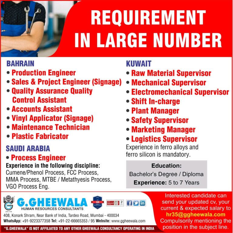 REQUIREMENT IN LARGE NUMBER BAHRAIN• Production Engineer• Sales & Project Engineer (Signage)• Quality Assurance QualityControl Assistant• Accounts AssistantVinyl Applicator (Signage)• …