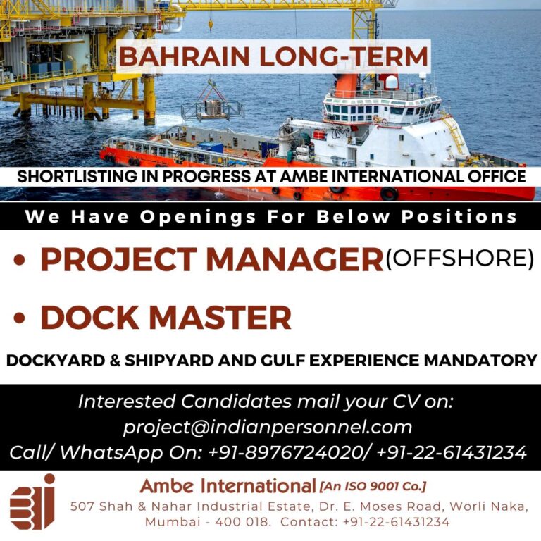 BAHRAIN LONG-TERMSHORTLISTING IN PROGRESS AT AMBE INTERNATIONAL OFFICEWe Have Openings For Below Positions• PROJECT MANAGER(OFFSHORE)• DOCK MASTERDOCKYARD & SHIPYARD AND …