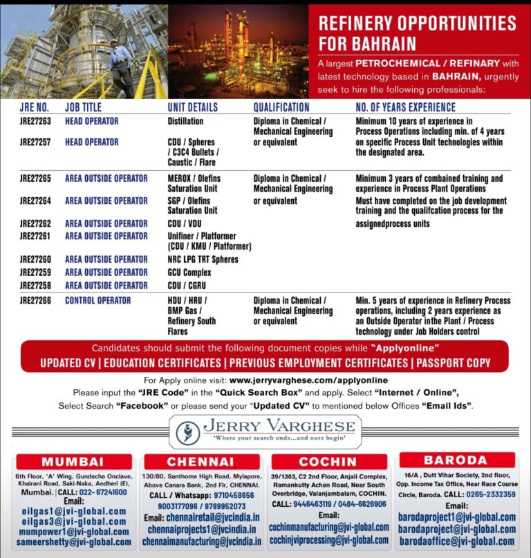 REFINERY OPPORTUNITIES FOR BAHRAINA largest PETROCHEMICAL/REFINARY with latest technology based in BAHRAIN,urgently seek to hire the following professionals:QUALIFICATION Diploma in …