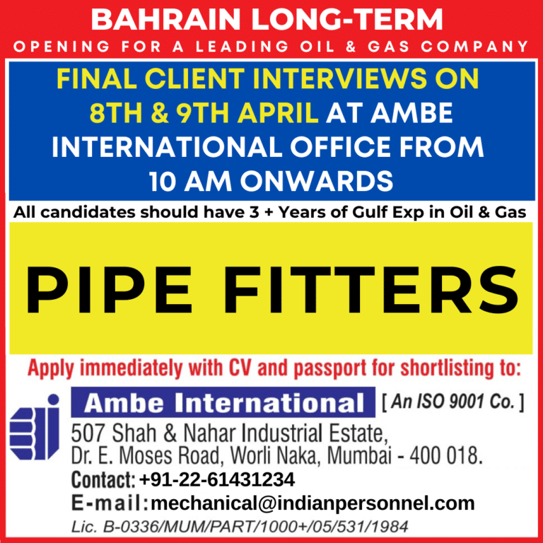 BAHRAIN LONG-TERMOPENING FOR A LEADING OIL & GAS COMPANYFINAL CLIENT INTERVIEWS ON 8TH & 9TH APRIL AT AMBE INTERNATIONALOFFICE FROM …