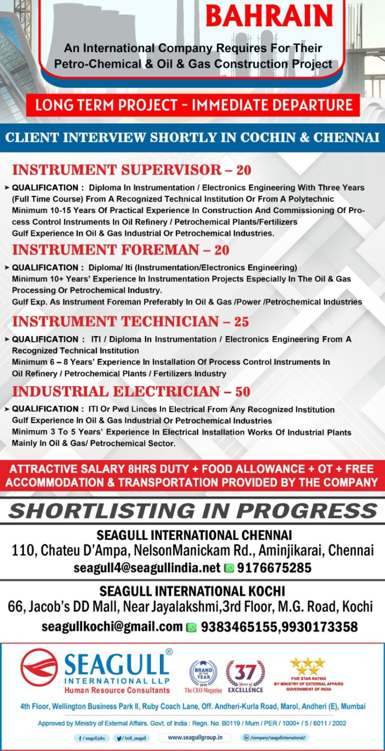 BAHRAINAn International Company Requires For Their Petro-Chemical &Oil & Gas Construction ProjectLONGTERM PROJECT – IMMEDIATE DEPARTURECLIENT INTERVIEW SHORTLY IN COCHIN …