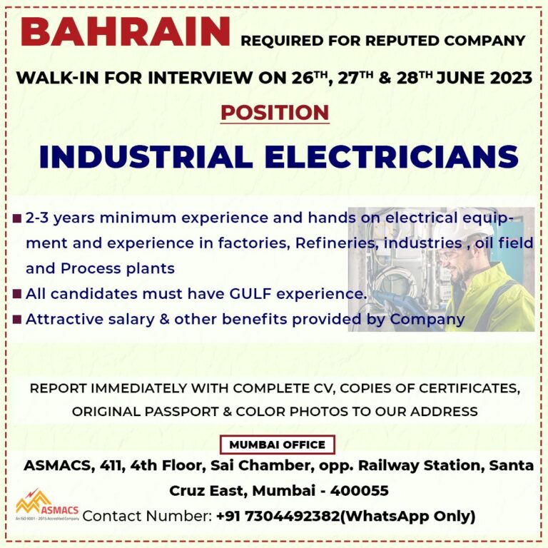 BAHRAINWALK-IN FOR INTERVIEW ON 26TH, 27TH & 28TH JUNE 2023POSITIONREQUIRED FOR REPUTED COMPANYINDUSTRIAL ELECTRICIANS12-3 years minimum experience and hands on …