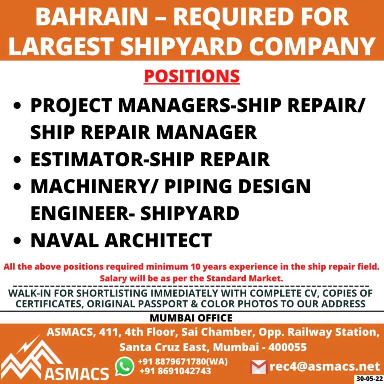 BAHRAIN – REQUIRED FORLARGEST SHIPYARD COMPANYPOSITIONSPROJECT MANAGERS-SHIP REPAIR/SHIP REPAIR MANAGERESTIMATOR-SHIP REPAIRMACHINERY/ PIPING DESIGNENGINEER- SHIPYARDNAVAL ARCHITECTAll the above positions required minimum …