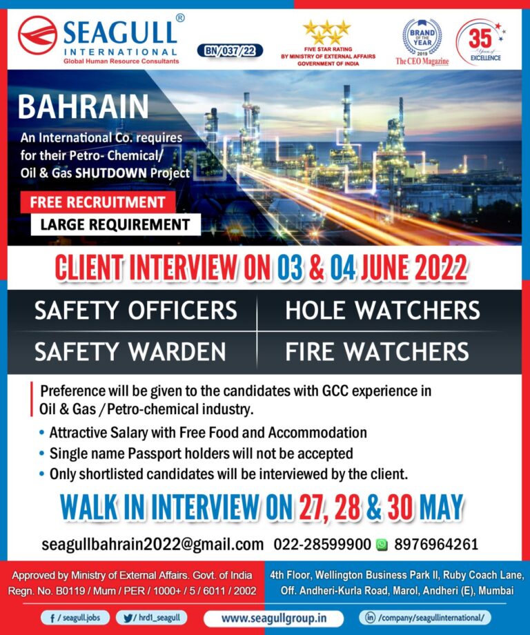 BAHRAINAn International Company requiresfor their Petro- ChemicalOil & SHUTDOWN Proje FREE RECRUITMENTLARGE REQUIREMENTEXCELLENCECLIENT INTERVIEW ON 2022SAFETY OFFICERSSAFETY WARDENHOLE WATCHERSFIRE WATCHERSPreference …