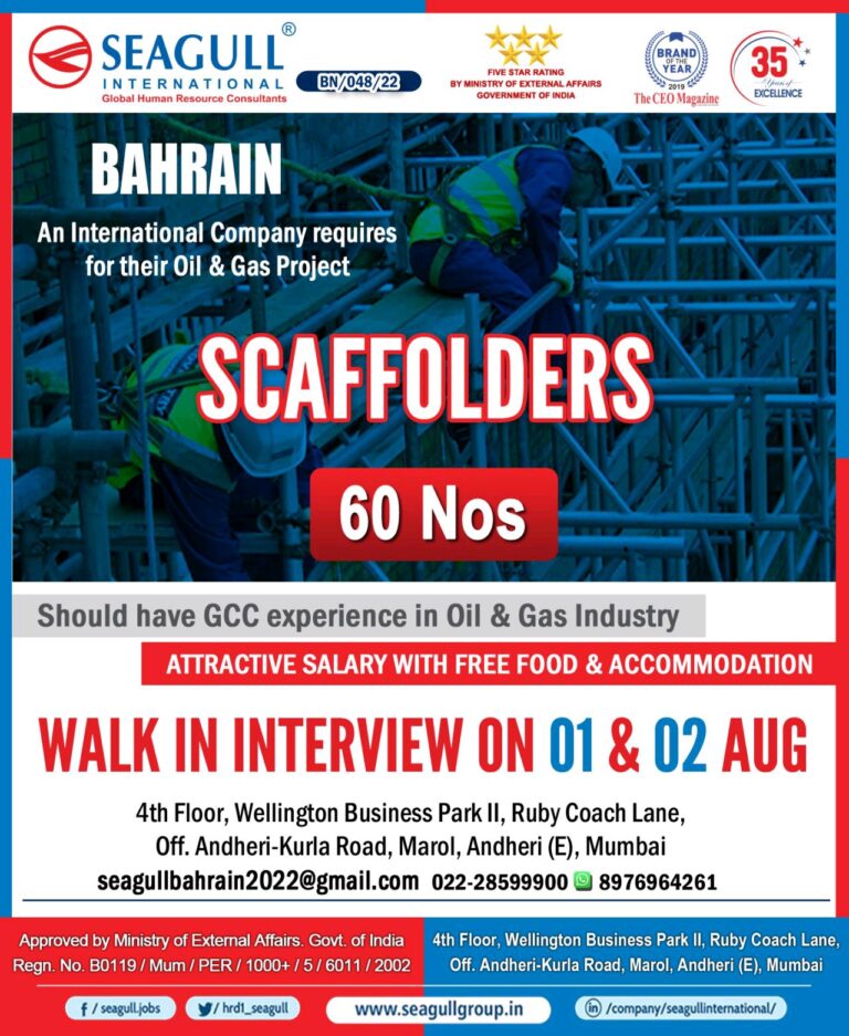 BAHRAINAn International Company requiresfor their Oil & Gas ?rojectFIVE STAR RATINGBY MINISTRY OF EXTERNAL AFFAIRSGOVERNMENT OF INDIAThe CEO MagazineSCAFFOLDERS60 NosShould …