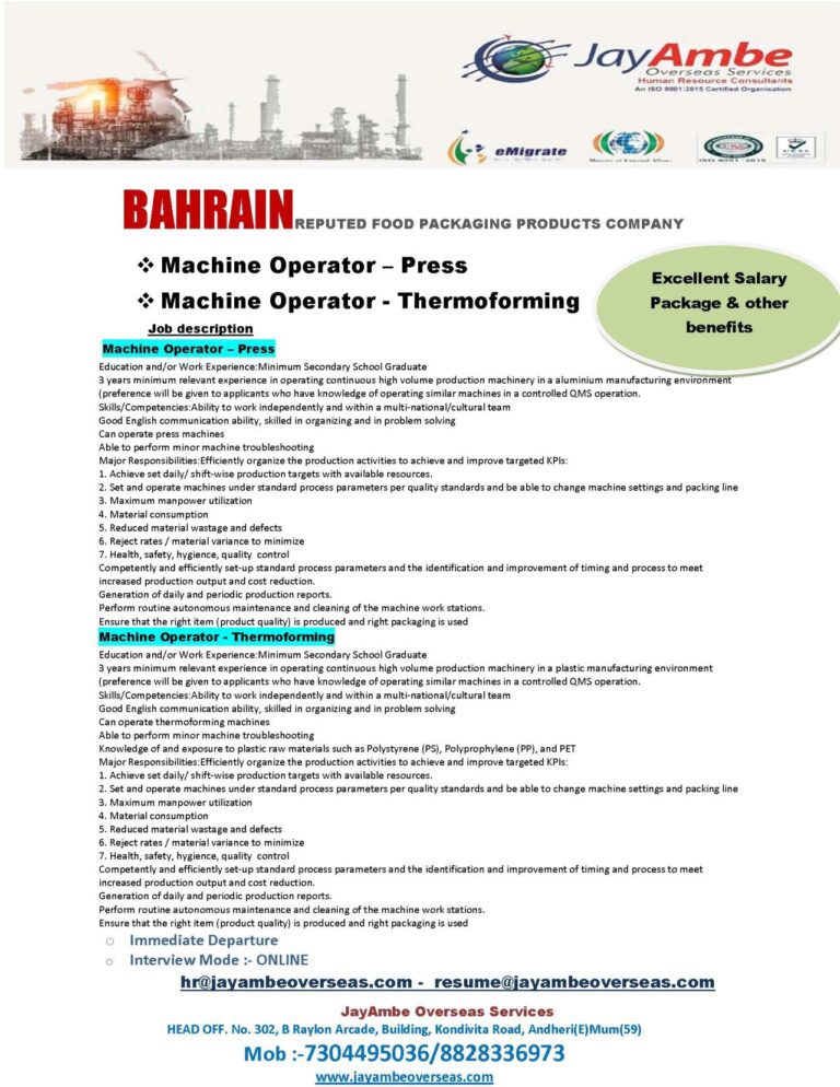 REPUTED FOOD PACKAGING PRODUCTS COMPANYMachine Operator — PressMachine Operator – ThermoformingJob descriptionMachine Operator — PressEducation and/or Work Experience:Minimum Secondary School …