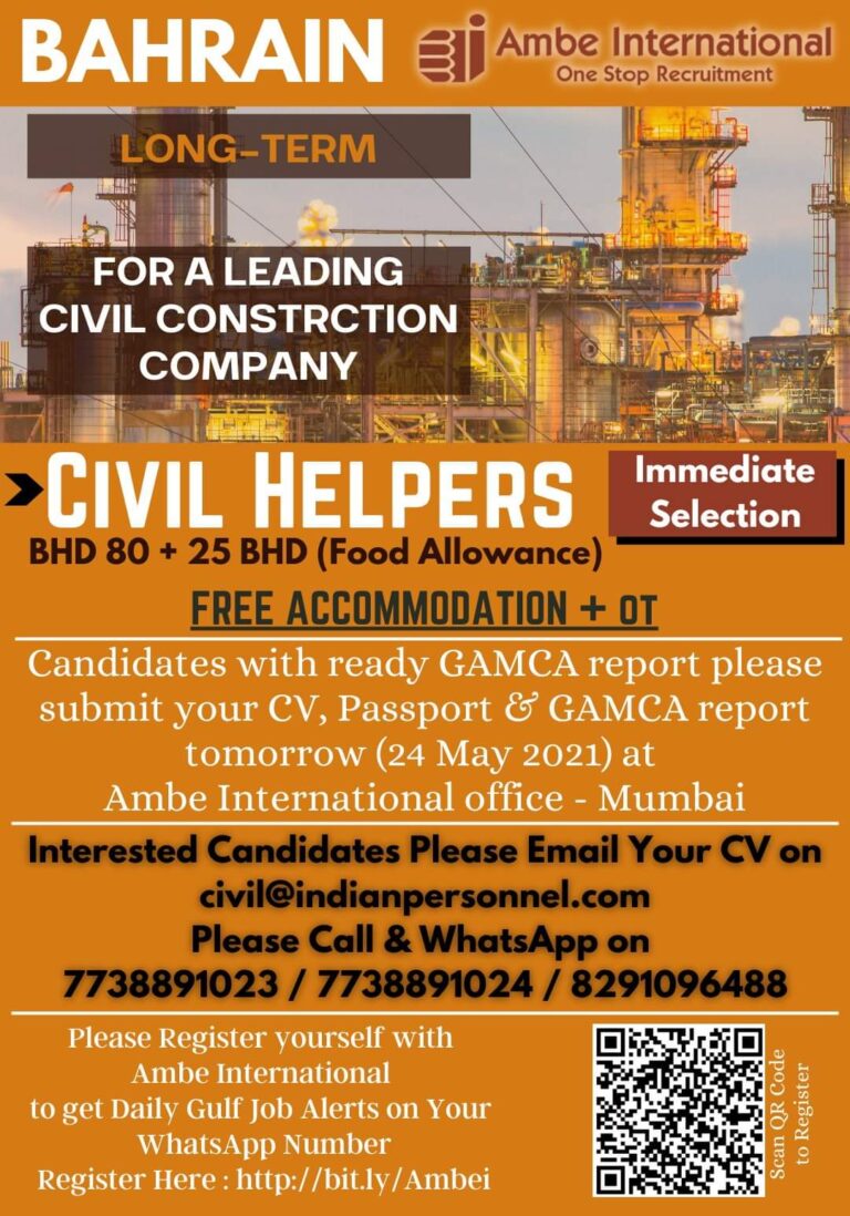 BAHRAIN Ambe InternationalOne Stop RecruitmentLONG TERMWe Have Opening for Below PositionsGENERAL HELPERS (Basic salary 80 BD), REFRACTORY e BLOCK MASONS(Basic …