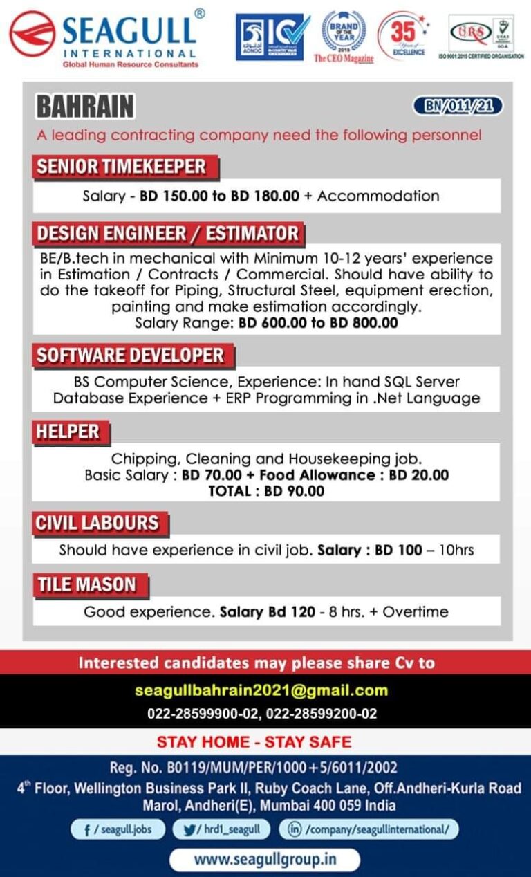 A leading contracting company need the following personnelSENIOR TIMEKEEPERSalary – BD 150.00 to BD 180.00 + AccommodationDESIGN ENGINEER / ESTIMATORBE/B.tech …
