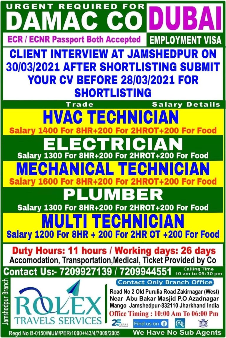 EMPLOYMENT VISACLIENT INTERVIEW AT JAMSHEDPUR ON3010312021 AFTER SHORTLISTING SUBMITYOUR CV BEFORE 2810312021 FORSHORTLISTINGT radeSalary DetailsHVAC TECHNICIANSalar 1400 For 8HR+200 For …
