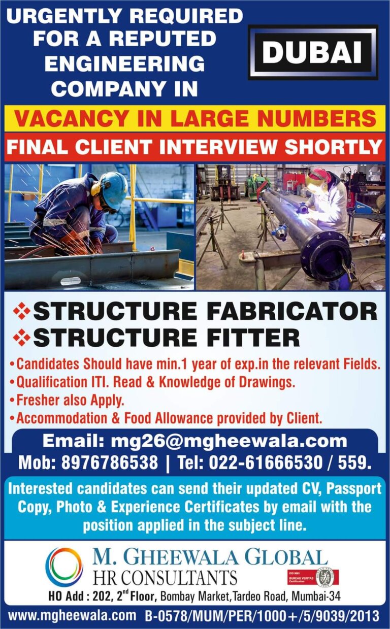 URGENTLY REQUIREDFOR A REPUTEDDUBAIENGINEERINGCOMPANY INVACANCY IN LARGE NUMBERSFINAL CLIENT INTERVIEW SHORTLYSTRUCTURE FABRICATORSTRUCTURE FITTER•Candidates Should have min.l year of exp.in the …