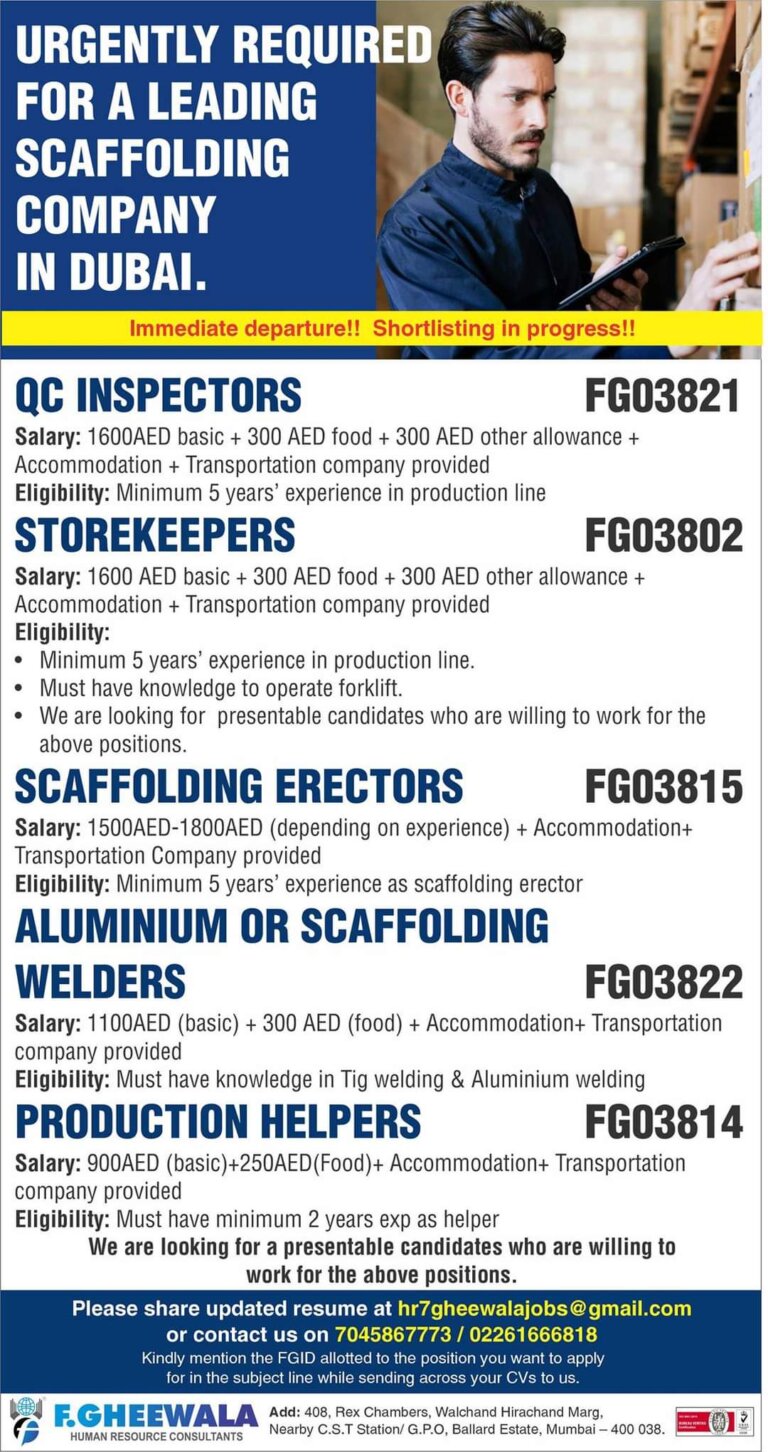 URGENTLY REQUIRE FOR A LEADING SCAFFOLDING COMPANY IN DUBAI. Salary: 1600AED basic + 300 AED food + 300 AED other …