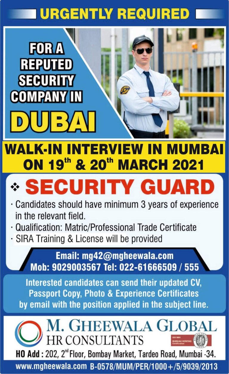 URGENTLY REQUIRED FOR A REPUTEDSECURITY COMPANY IN DUBAIWALK-IN INTERVIEW IN MUMBAION 19th & 20th MARCH 2021SECURITY GUARD• Candidates should have …