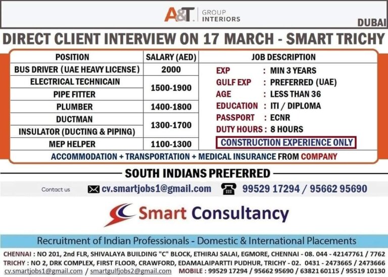 GROUP INTERIORS DUBAIDIRECT CLIENT INTERVIEW ON 17 MARCH – SMART TRICHYPOSITIONSALARY (AED)BUS DRIVER (I-JAE HEAVY LICENSE)ELECTRICAL TECHNICAINPIPE FITTERPLUMBERDUCTMANINSULATOR (DUCTING & …