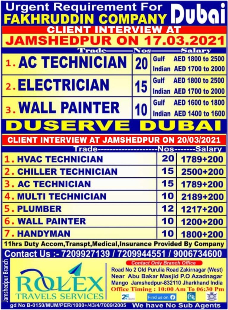 Urgent Requirement ForDUSERVE DubaiClient Interview AtJAMSHEDPUR ON 22.0312021Please Submit Your Cv & Passport Before Interview” Tradel. HVAC TECHNICIAN CHILLER TECHNICIAN …