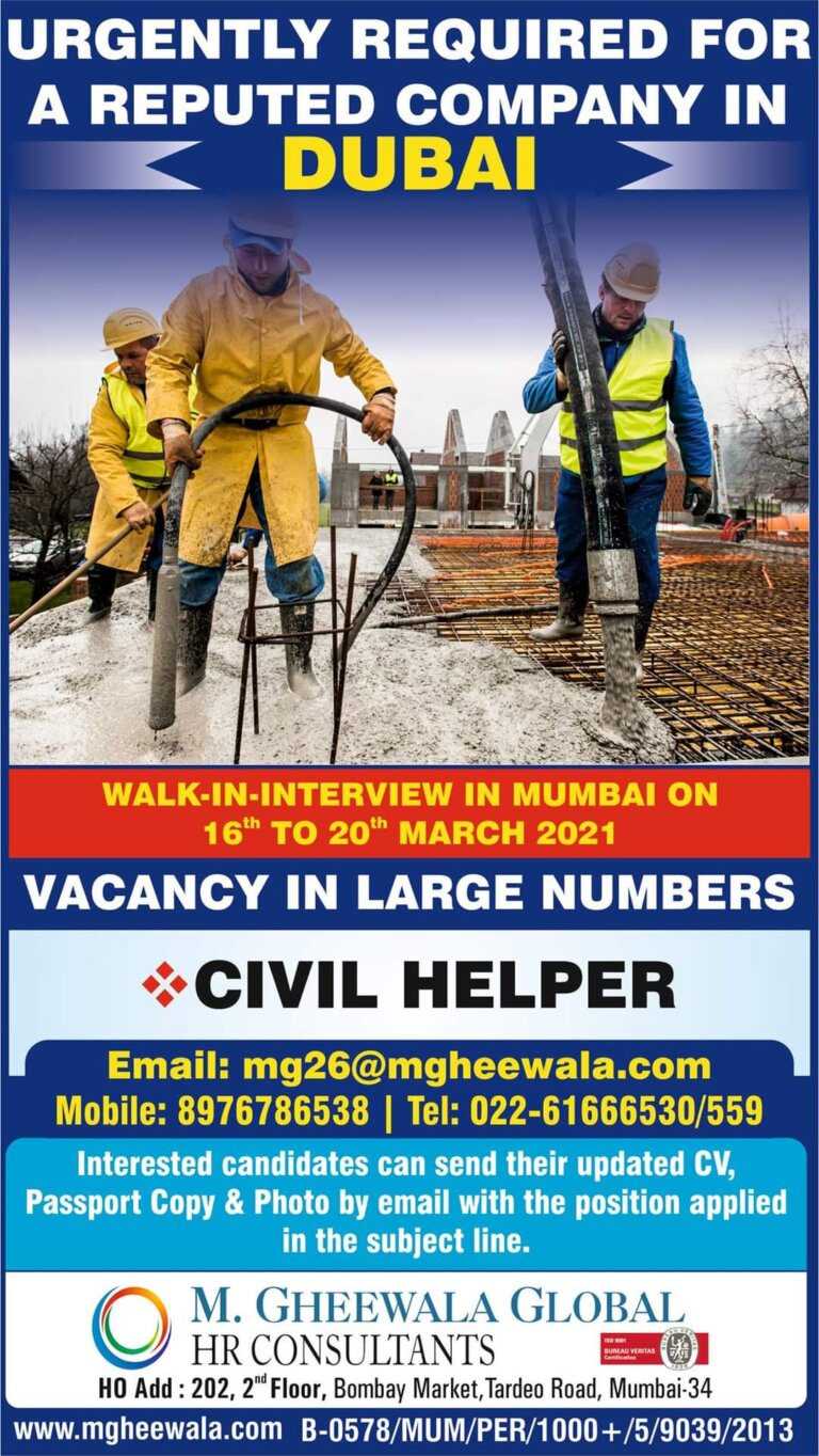 URGENTLY REQUIRED FORA REPUTED COMPANY INWALK-IN-INTERVIEW IN MUMBAI ON16th TO 20th MARCH 2021VACANCY IN LARGE NUMBERSCIVIL HELPEREmail: mg26@mgheewaIa.comMobile: 8976786538 | …