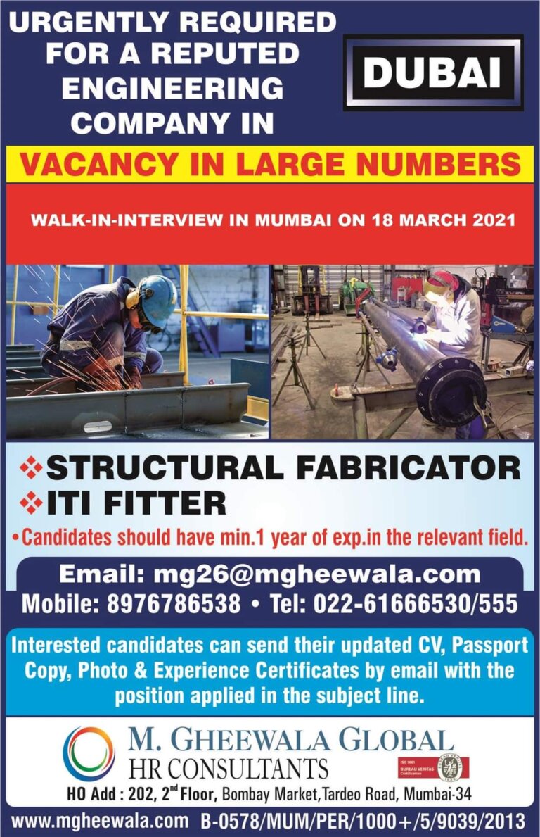 URGENTLY REQUIREDFOR A REPUTEDDUBAIENGINEERINGCOMPANY INVACANCY IN LARGE NUMBERSWALK-IN-INTERVIEW IN MUMBAI ON 18 MARCH 2021STRUCTURAL FABRICATORITI FITTER•Candidates should have min.l year …