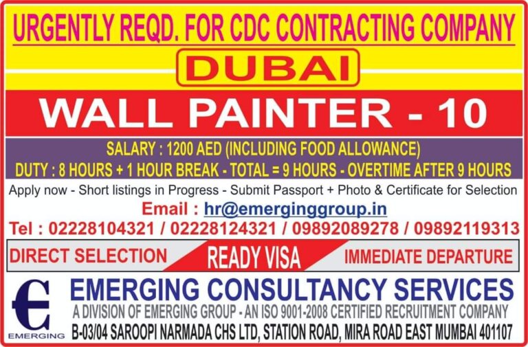 URGENTLY FOR CDC CONTRACTING COMPANYDUBAIWALL PAINTER – 10SALARY : 1200 AED (INCLUDING FOOD ALLOWANCE)DUTY : 8 HOURS + I HOUR …