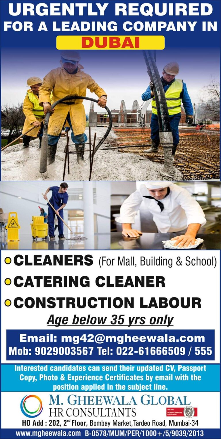 URGENTLY REQUIRED FOR A LEADING COMPANY IN DUBAI cleaners (For Mall, Building & School) °CATERING CLEANER o CONSTRUCTION LABOUR Age …