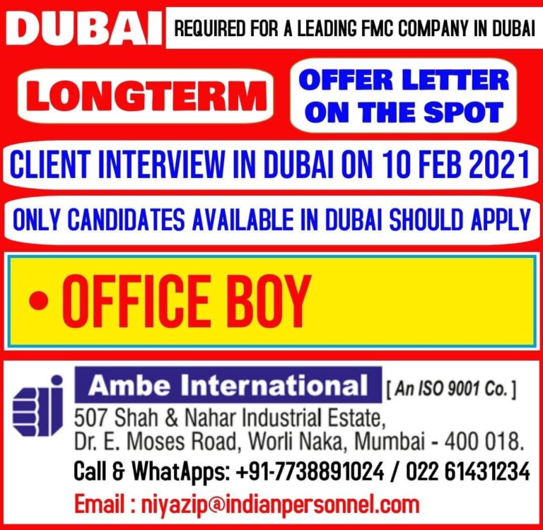 DUBAI REQUIRED FOR A LEADING FMC COMPANY IN DUBAIOFFER ON THE SPOTCLIENT INTERVIEW IN DUBAI ON 10 FEB 2021ONLY CANDIDATES …