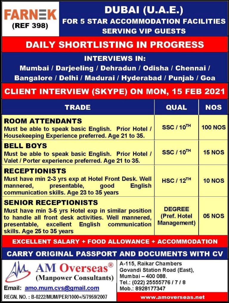 DUBAI (U.A.E.)FOR 5 STAR ACCOMMODATION FACILITIES(REF 398)SERVING VIP GUESTSDAILY SHORTLISTING IN PROGRESSINTERVIEWS IN:Mumbai I Darjeeling I Dehradun I Odisha I …