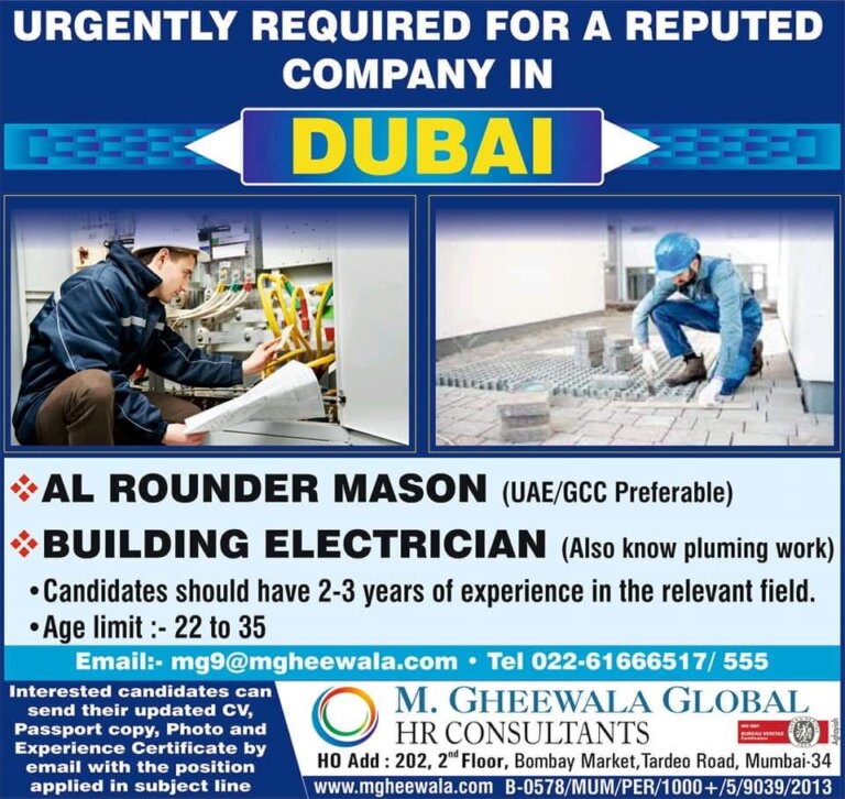 URGENTLY REQUIRED FOR A REPUTEDCOMPANY IN DUBAI•AL ROUNDER MASON Preferable)•BUILDING ELECTRICIAN (Also know pluming work)• Candidates should have 2-3 years …
