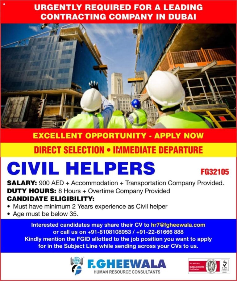 URGENTLY REQUIRED FOR A LEADINGCONTRACTING COMPANY IN DUBAIEXCELLENT OPPORTUNITY • APPLY NOWDIRECT SELECTION IMMEDIATE DEPARTURECIVIL HELPERSFG32105SALARY: 900 AED + Accommodation …