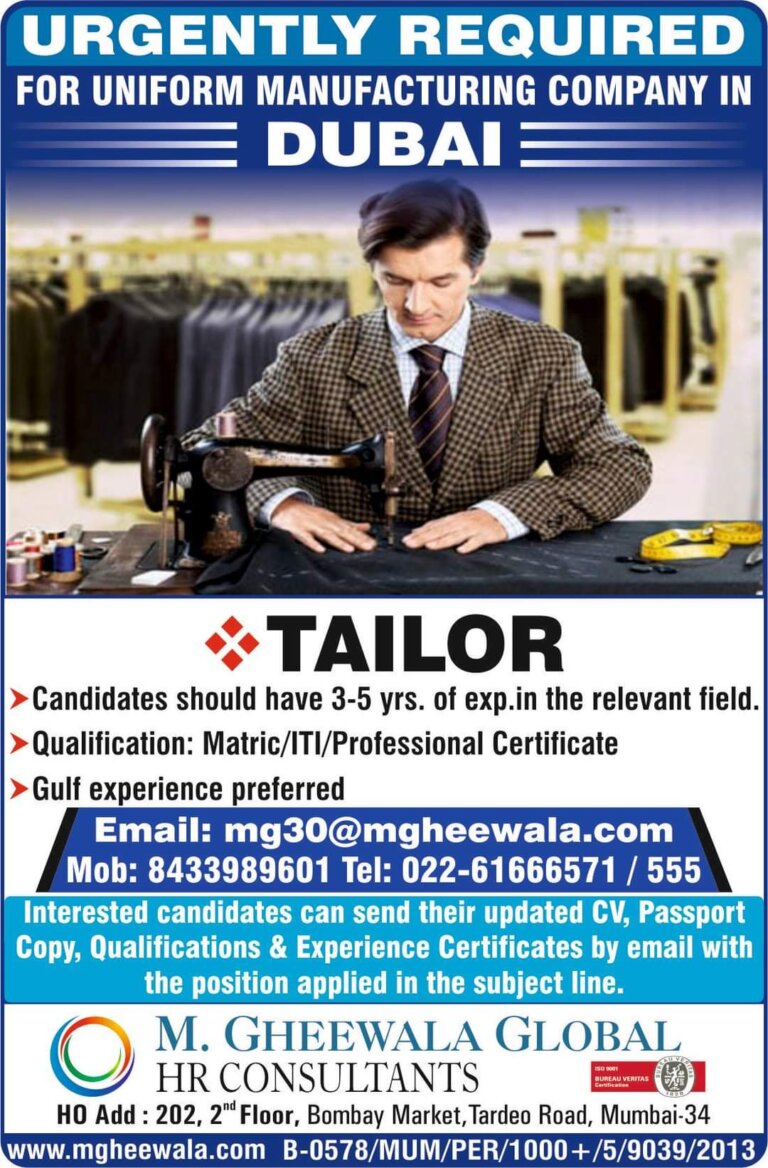 URGENTLY REQUIREDFOR UNIFORM MANUFACTURING COMPANY INDUBAITAILOR Candidates should have 3-5 yrs. of exp.in the relevant field.Qualification: Matric/ITl/ProfessionaI CertificateGuIf experience preferredEmail: …