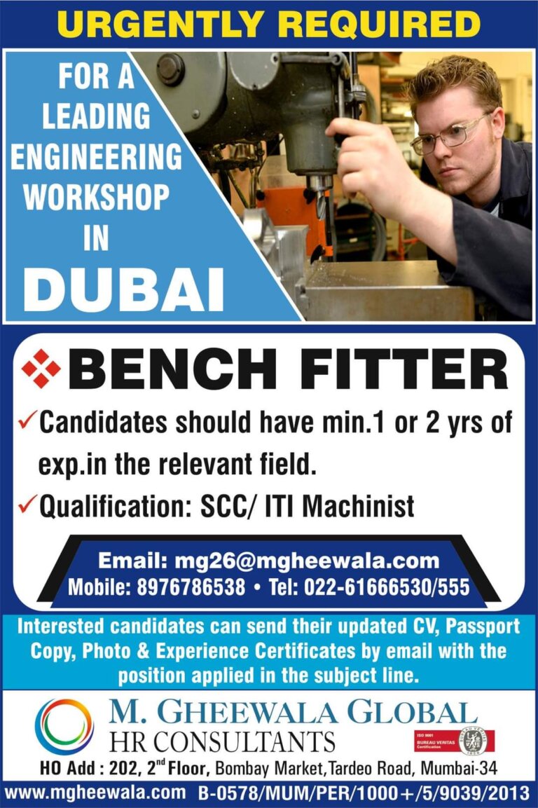 URGENTLY REQUIRED FOR A LEADINGENGINEERING WORKSHOP DUBAIBENCH FITTERCandidates should have min.l or 2 yrs ofexp.in the relevant field.Qualification: SCC/ ITI …