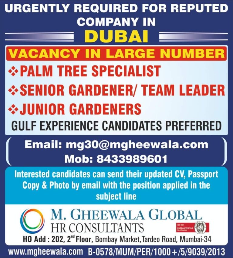URGENTLY REQUIRED FOR REPUTEDCOMPANY IN DUBAIVACANCY IN LARGE NUMBERPALM TREE SPECIALISTSENIOR GARDENER/ TEAM LEADERJUNIOR GARDENERSGULF EXPERIENCE CANDIDATES PREFERREDEmail: mg30@mgheewala.comMob: 8433989601Interested …