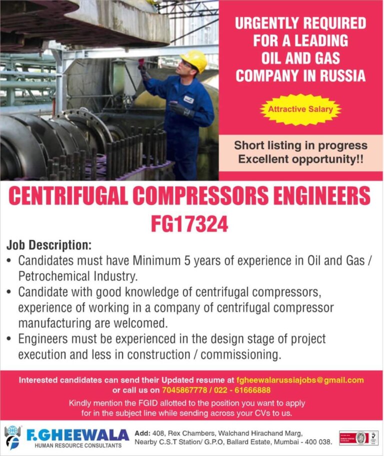 URGENTLY REQUIRED FOR A LEADING OIL AND GAS COMPANY IN RUSSIA Short listing in progress Excellent opportunity!!CENTRIFUGAL COMPRESSORS ENGINEERS FG17324Joh …