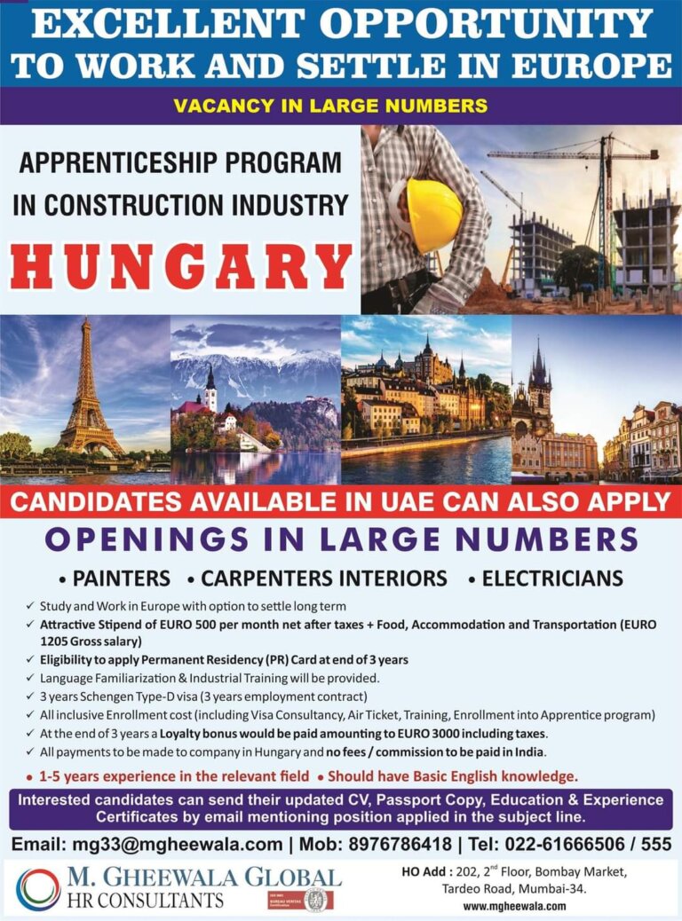 EXCELLENT OPPORTUNITYTO WORK AND SETTLE IN EUROPEVACANCY IN LARGE NUMBERSAPPRENTICESHIP PROGRAMIN CONSTRUCTION INDUSTRYHUNGARY i’CANDIDATES AVAILABLE IN I-JAE CAN ALSO APPLYOPENINGS …