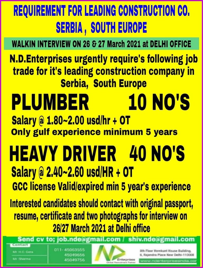 REQUIREMENT FOR LEADING CONSTRUCTIONSERBIA, SOUTH EUROPEWALKIN INTERVIEW ON 26 27 March 2021 at DELHI OFFICEN.D.Enterprises urgently require’s following jobtrade for …