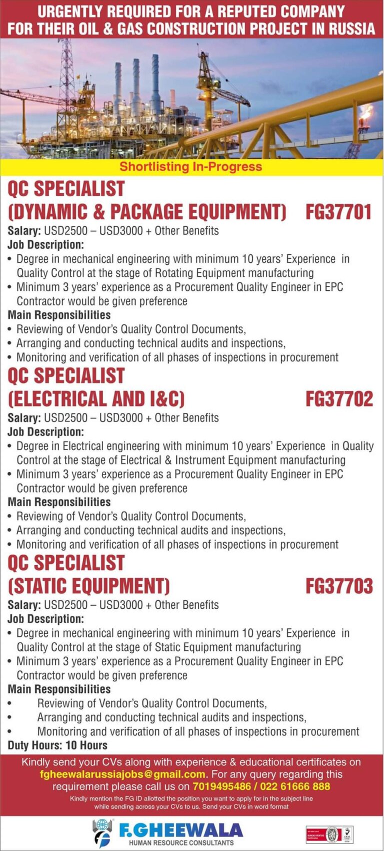 URGENTLY REQUIRED FOR A REPUTED COMPANYFOR THEIR OIL & GAS CONSTRUCTION PROJECT IN RUSSIAShortlisting In-ProgressOC SPECIALIST(DYNAMIC & PACKAGE EQUIPMENT) FG37701salary: …