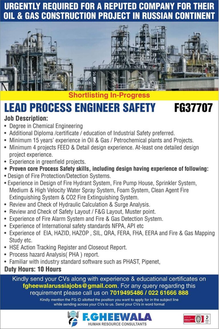 URGENTLY REQUIRED FOR A REPUTED COMPANY FOR THEIR OIL & GAS CONSTRUCTION PROJECT IN RUSSIAN CONTINENTShortlisting In-ProgressLEAD PROCESS ENGINEER SAFETY …