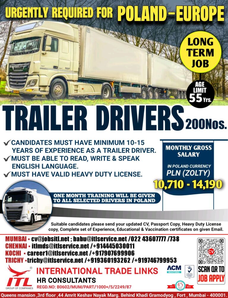 TRAILER DRIVERS200Nos.CANDIDATES MUST HAVE MINIMUM 10-15MONTHLY GROSSYEARS OF EXPERIENCE AS A TRAILER DRIVER.VMUST BE ABLE TO READ, WRITE & SPEAKENGLISH …